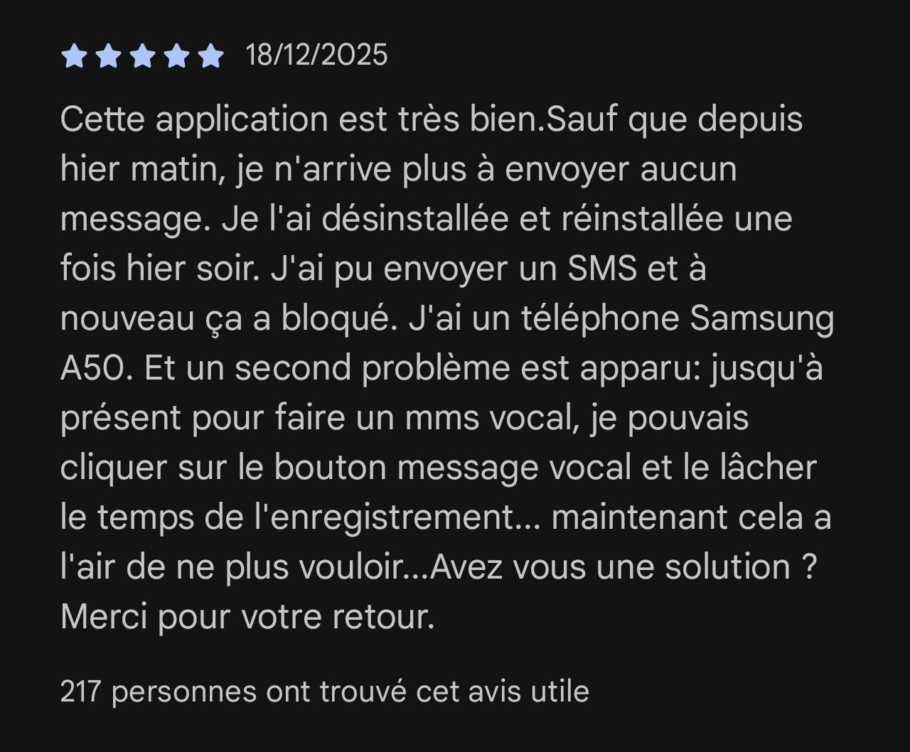 Mamydom Posté(e) le 19 décembre 2025 Signaler Posté(e) le 19 décembre 2025 Je ne pouvais plus envoyer de "SMS". Après avoir tenté toutes les consignes déjà données sur le "web" (réinitialisation des paramètres réseaux, extinction du smartphone, etc ...) et malgré le concours infructueux du service client, j'ai fini par résoudre mon problème de blocage de l'envoi des "SMS" (je pouvais en recevoir) en désinstallant l'application "Google message" et en réinstallant la mise à jour qui m'était proposée par "Googleplay" 😉 Citer